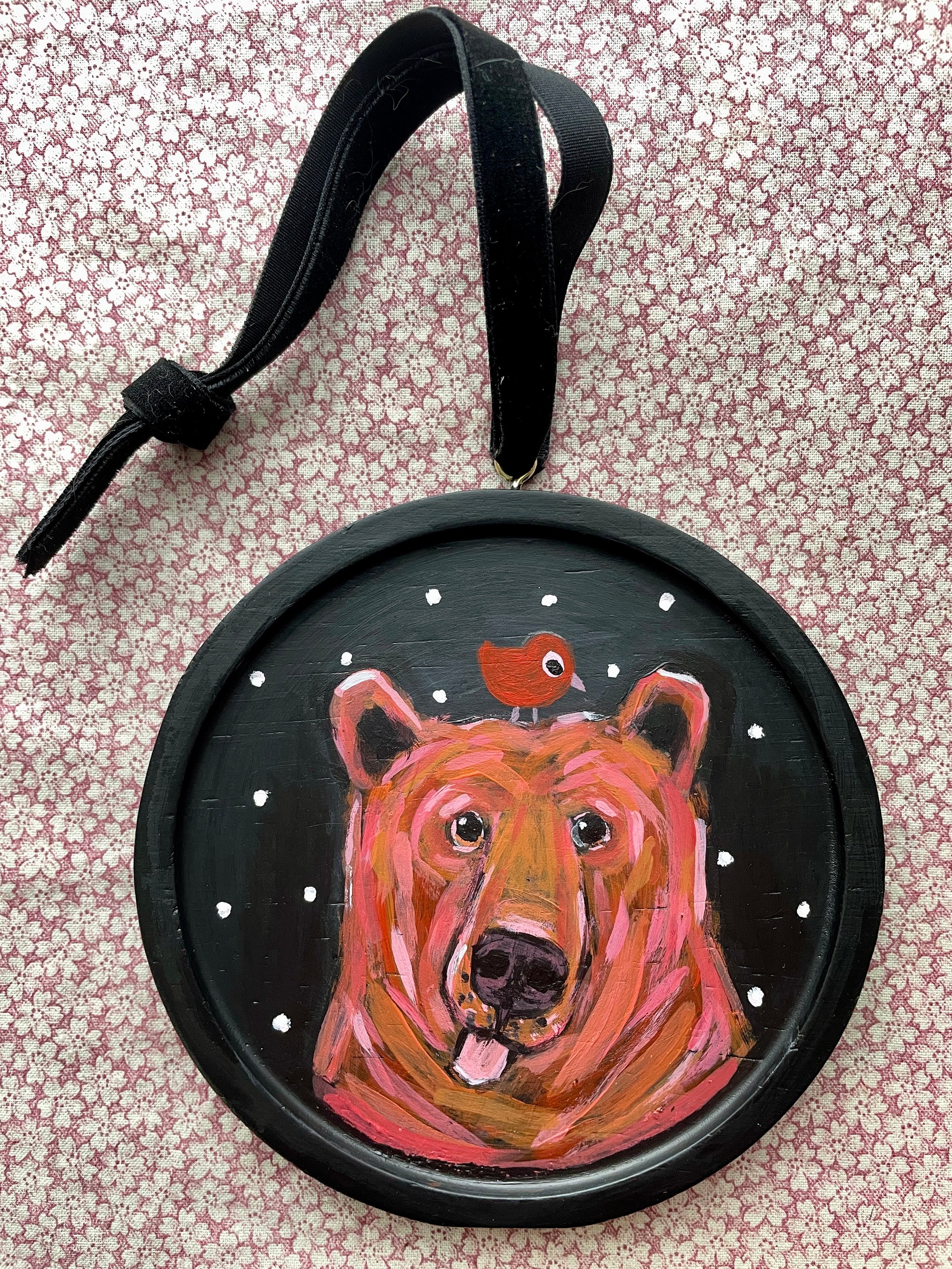 Brown Bear and Red Bird handmade upscaled wood coaster Christmas tree ornament gift. Cute acrylic painting of a brown bear face with a funny red bird on its head in a snowy background scene. Color palette is brown, black, pink, red and white tones. Size is 4.5" x 4.5" x .5" round. Sealed and protected with satin varnish and signed and dated on the back. Brass screw eye with a black velvet ribbon for hanging on the tree!