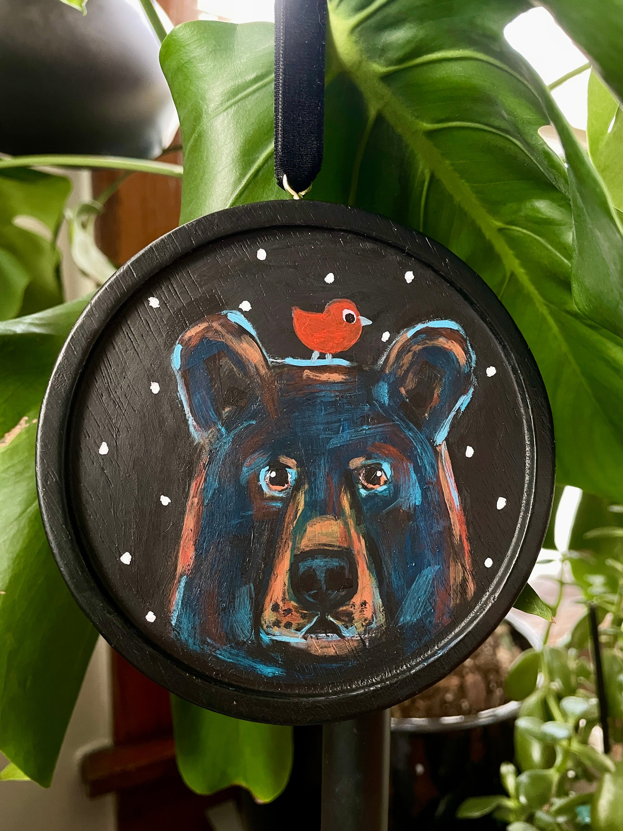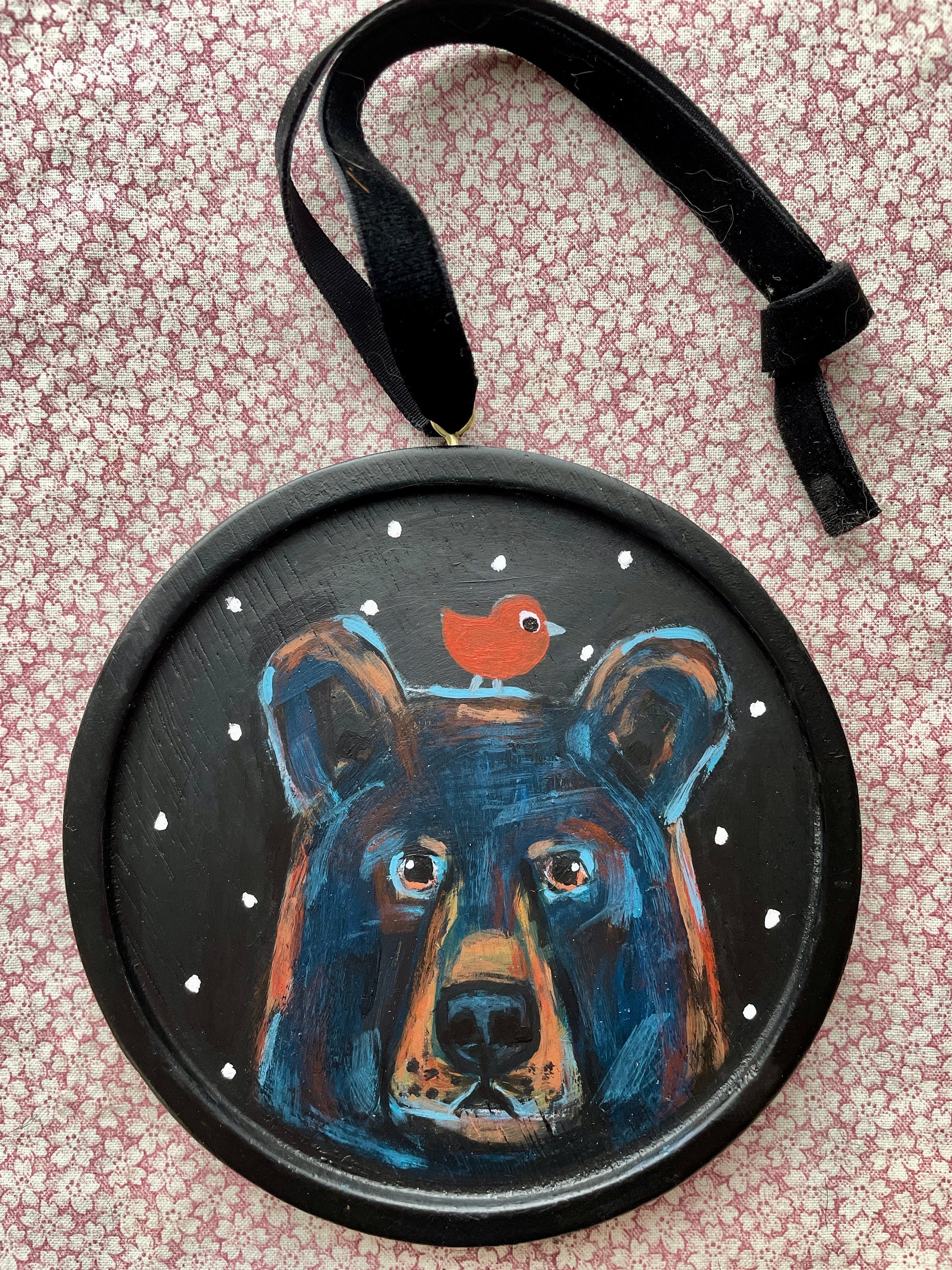 Black Bear and Red Bird handmade upscaled wood coaster Christmas tree ornament gift. Cute acrylic painting of a black bear face with a funny red bird on its head in a snowy background scene. Color palette is blue, black, red and white tones. Size is 4.5" x 4.5" x .5" round. Sealed and protected with satin varnish and signed and dated on the back. Brass screw eye with a black velvet ribbon for hanging on the Christmas tree!