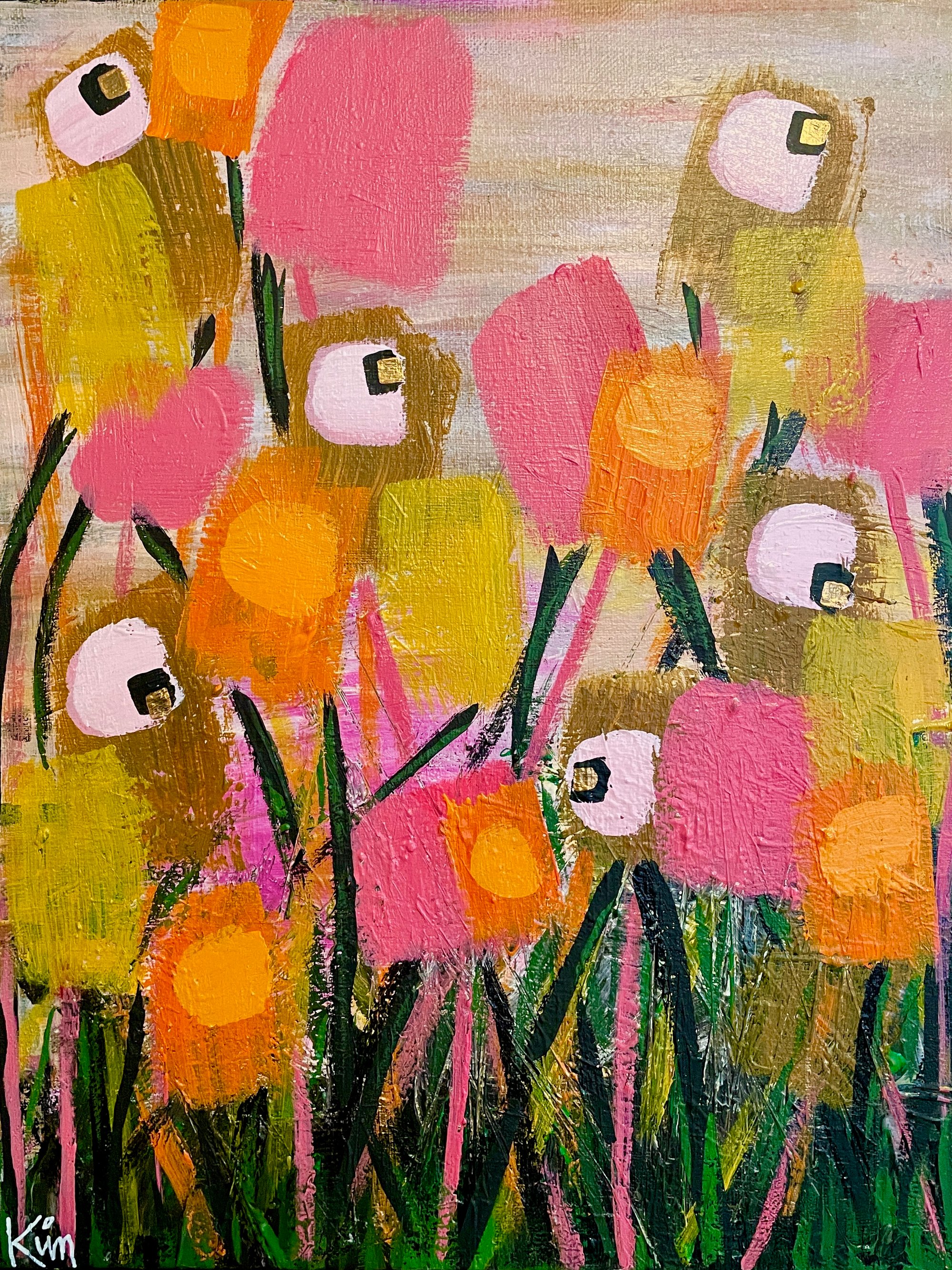 Abstract flower field of pink, yellow and orange flowers with a pop of copper and loads of layers and texture marks against a soft pink sky background.